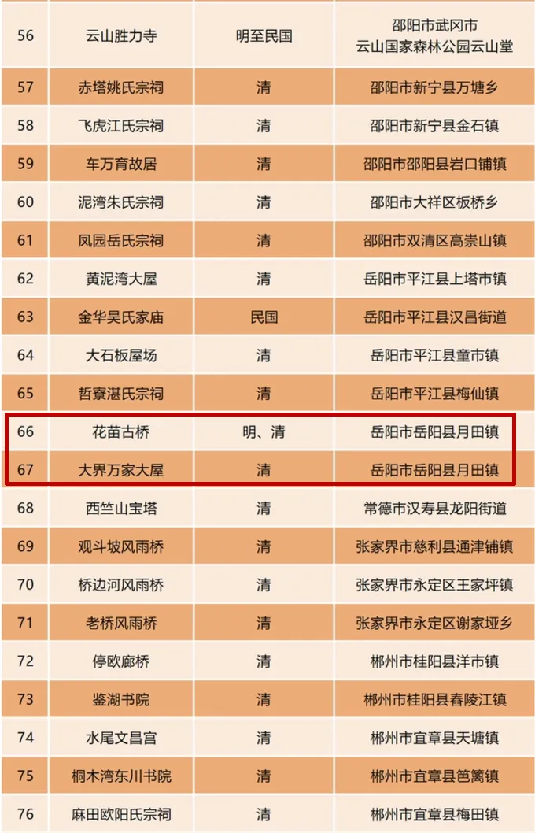 近日,湖南省人民政府印發通知,決定將嶽陽縣花苗古橋、大界萬家大屋兩處文物確定為第十二批省級文物保護單位