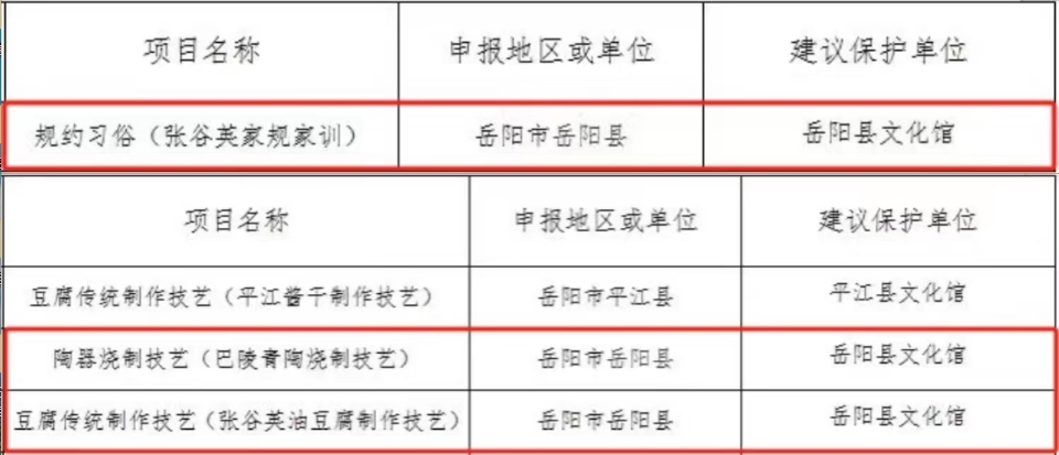 11月13日,湖南省文化和旅遊廳發布《關於第六批省級非物質文化遺產代表性項目名錄推薦項目名單的公示》,提出湖南省第六批省級非物質文化遺產代表性項目名錄推薦項目254項,其中新增109項,擴展145項。其中,嶽陽縣的張穀英家規家訓、巴陵青陶燒製技藝、張穀英油豆腐製作技藝3個項目入選。