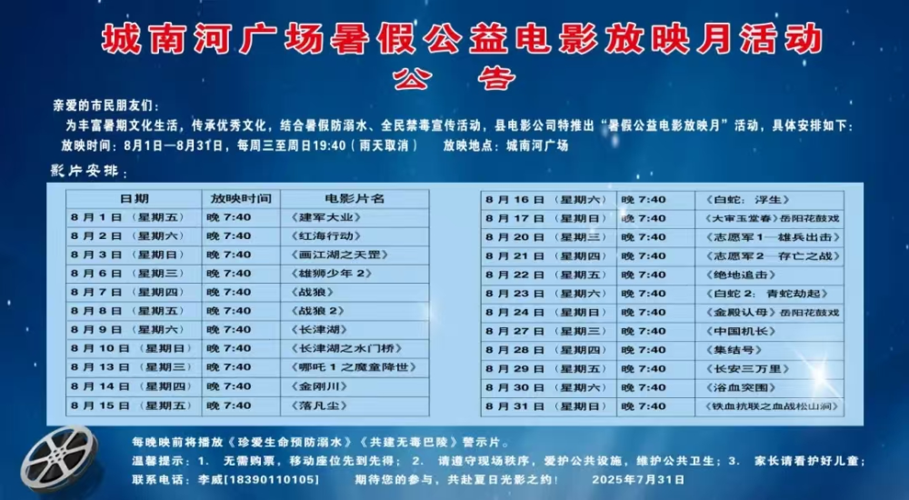 每晚映前將播放《珍愛生命預防溺水》《共建無毒巴陵》警示片。