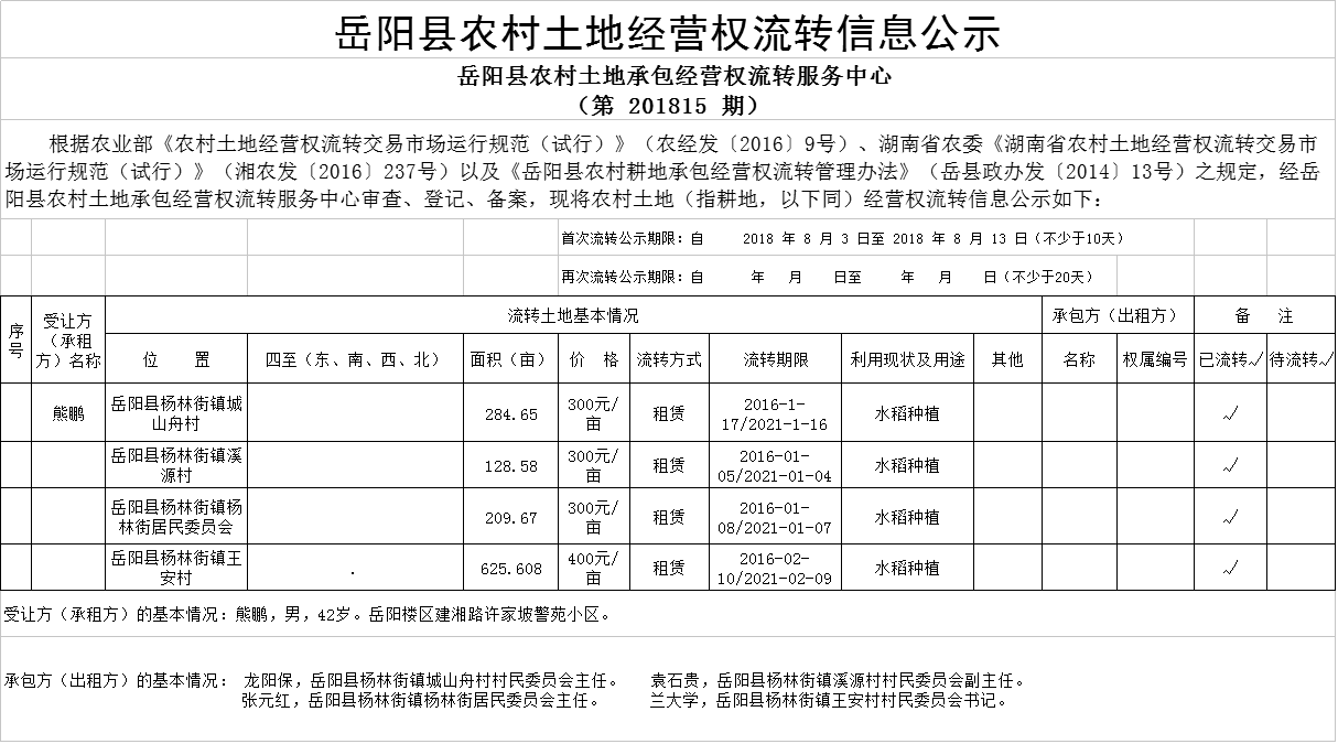 嶽陽縣農村土地經營權流轉信息公示 (第 201815 期)