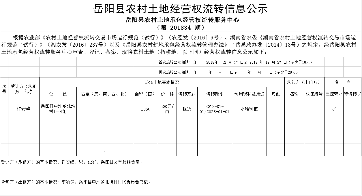 嶽陽縣農村土地經營權流轉信息公示(第 201834 期)
