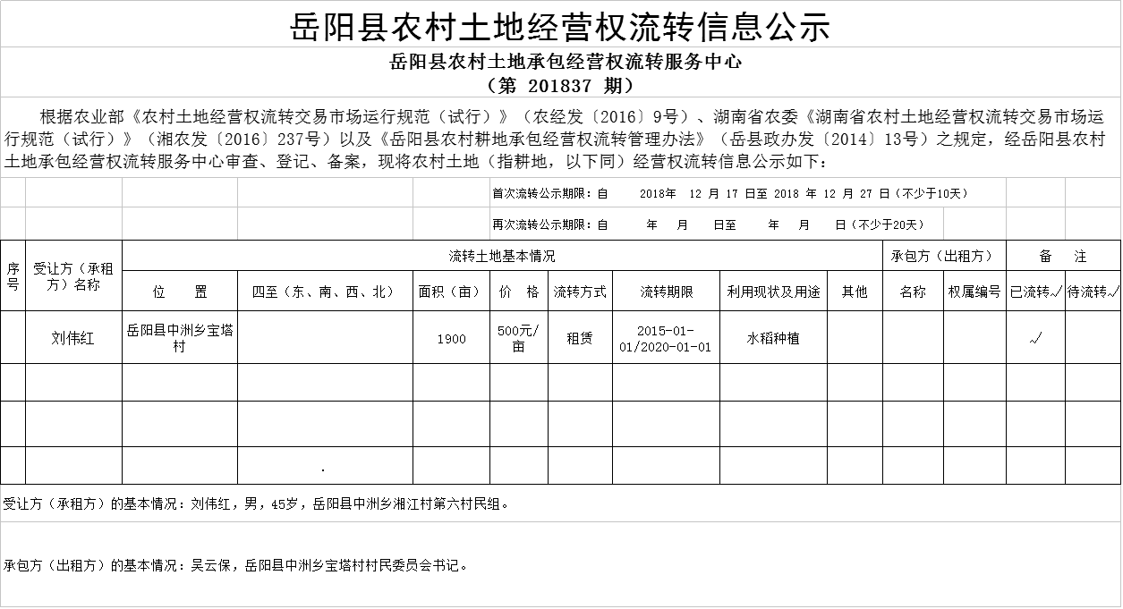 嶽陽縣農村土地經營權流轉信息公示(第 201837 期)