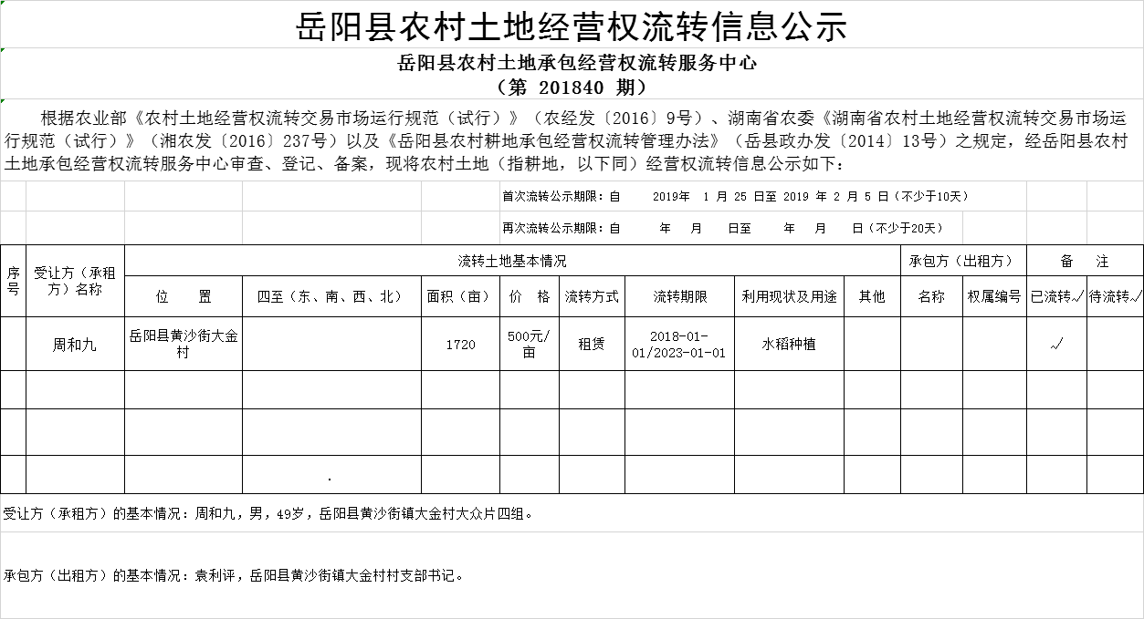 嶽陽縣農村土地經營權流轉信息公示(第 201840 期)