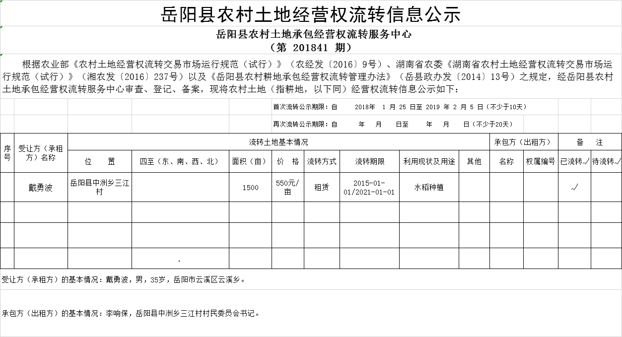 嶽陽縣農村土地經營權流轉信息公示 (第 201841 期)
