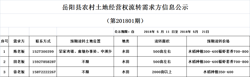 嶽陽縣土地流轉需求方信息公示(第201801期)
