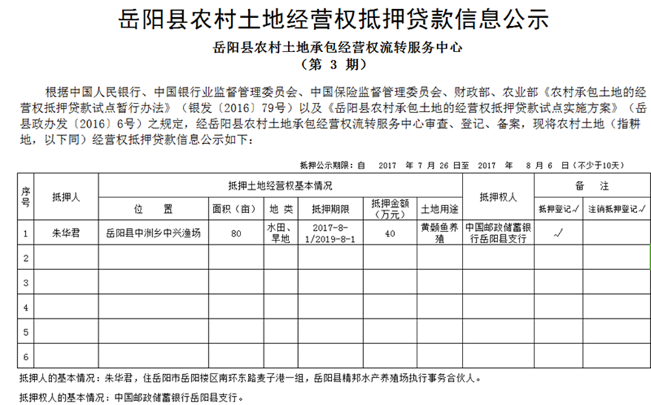 嶽陽縣農村土地經營權抵押貸款信息公示(第3期)