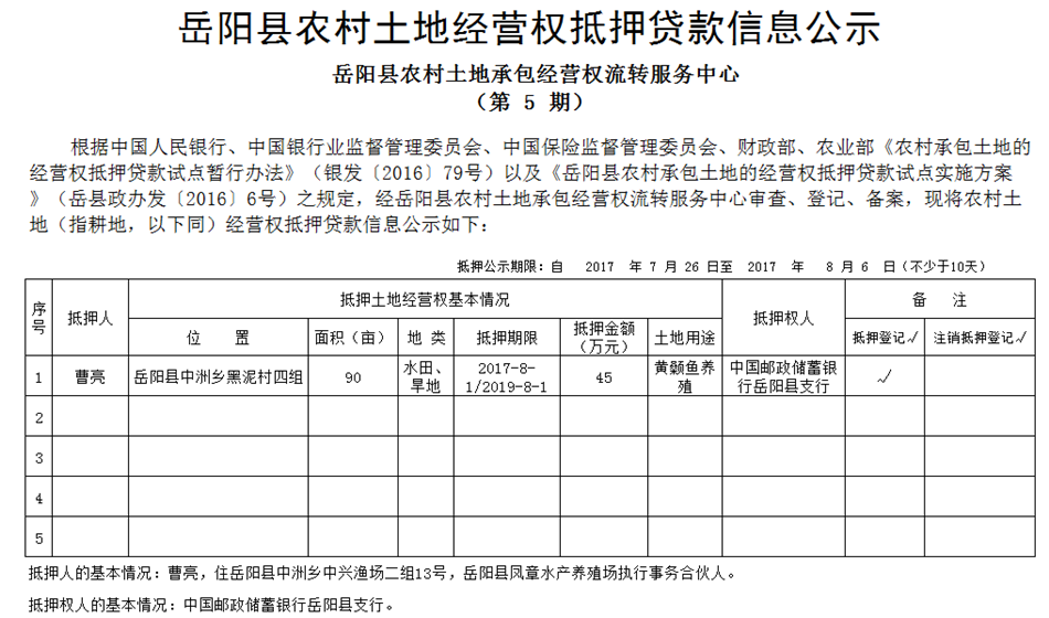 嶽陽縣農村土地經營權抵押貸款信息公示(第5期)