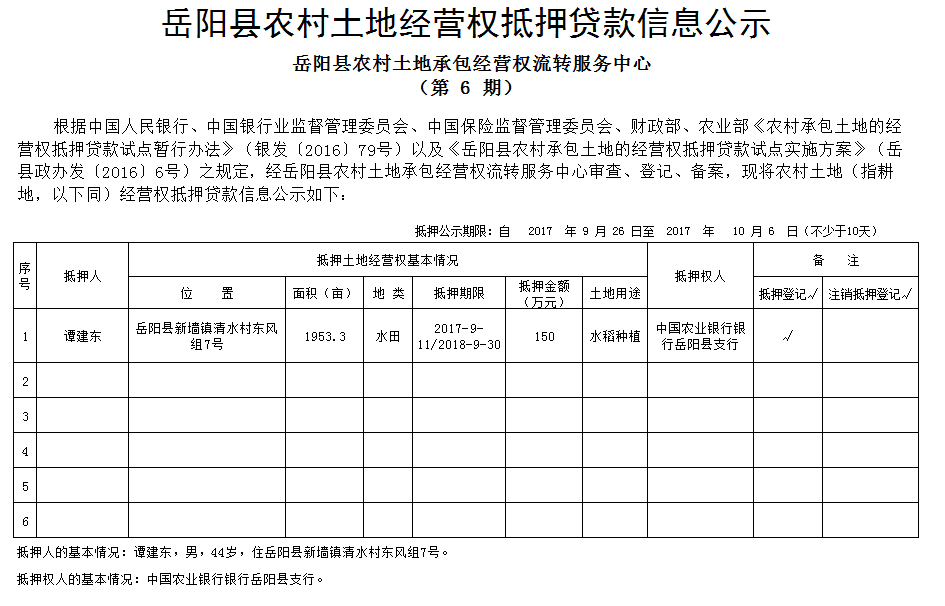 嶽陽縣農村土地經營權抵押貸款信息公示(第6期)