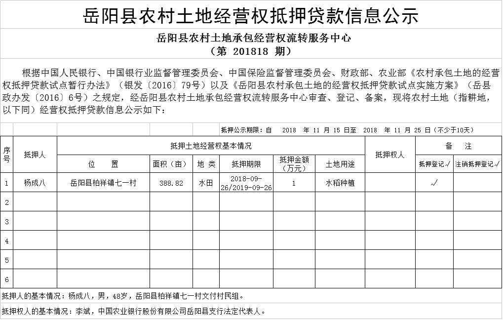 嶽陽縣農村土地經營權抵押貸款信息公示(第 201818 期)