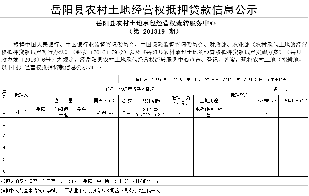 嶽陽縣農村土地經營權抵押貸款信息公示(第 201819 期)
