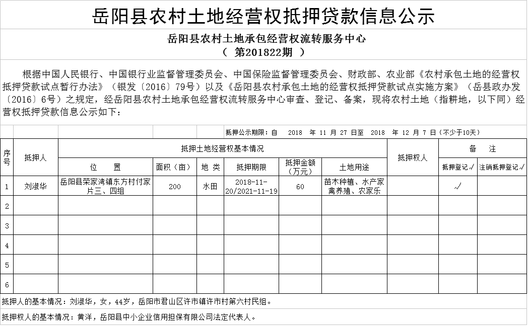 嶽陽縣農村土地經營權抵押貸款信息公示( 第201822期 )