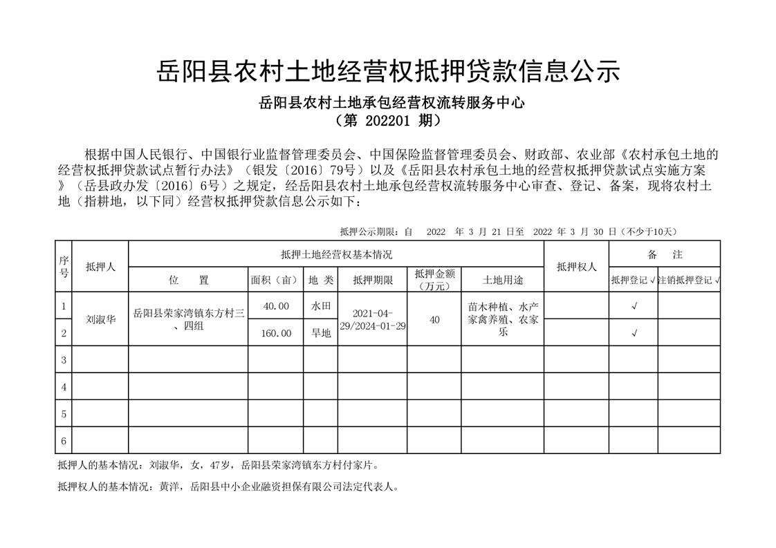 嶽陽縣農村土地經營權抵押貸款信息公示 (第 202201 期)