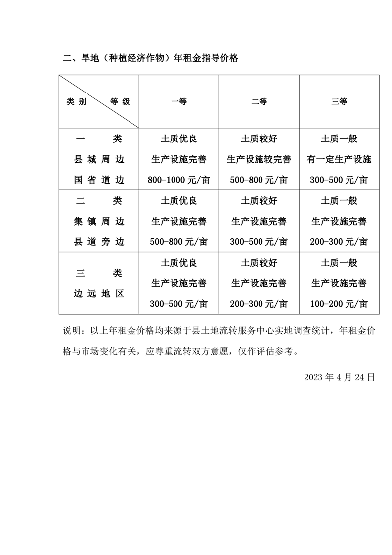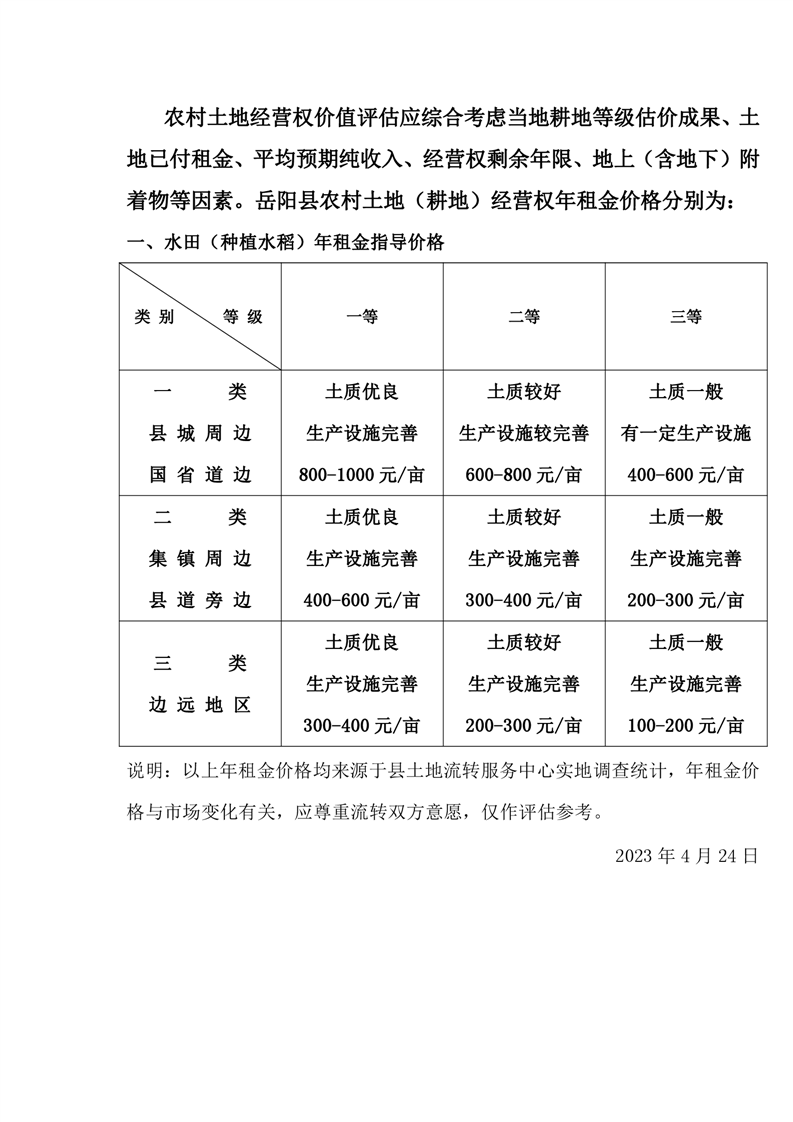 嶽陽縣農村土地(耕地)經營權指導價格
