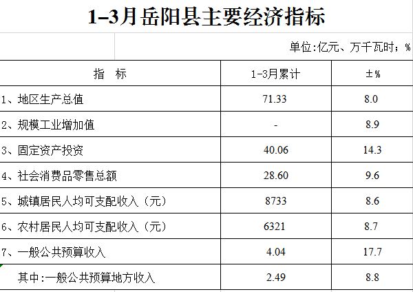 2019年1-3月嶽陽縣主要經濟指標