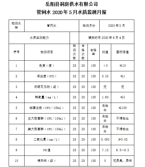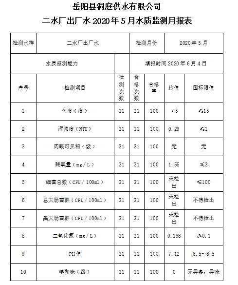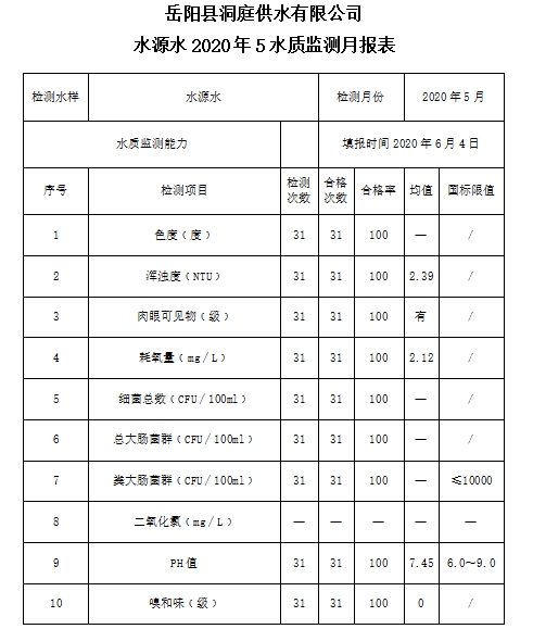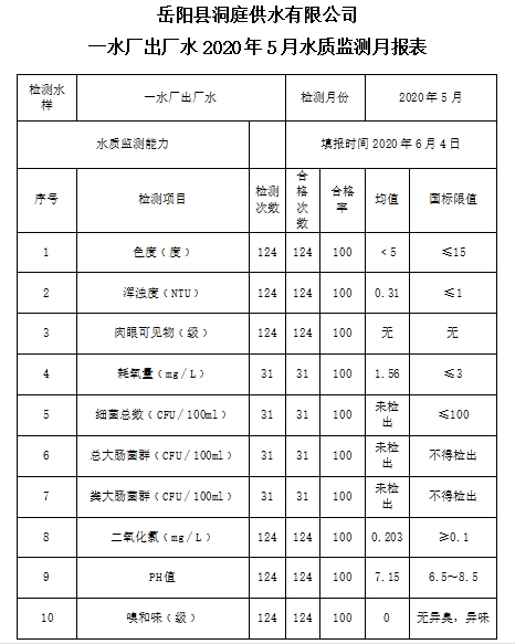 嶽陽縣洞庭供水有限公司關於2020年5月份的水源水、管網水、一水廠二水廠出廠水水質監測報表