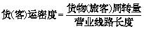 貨(客)運密度  指在一定時期內某種運輸方式在營運線路的某一區段平均每公裏線路通過的貨物(旅客)運輸周轉量。計算公式為: