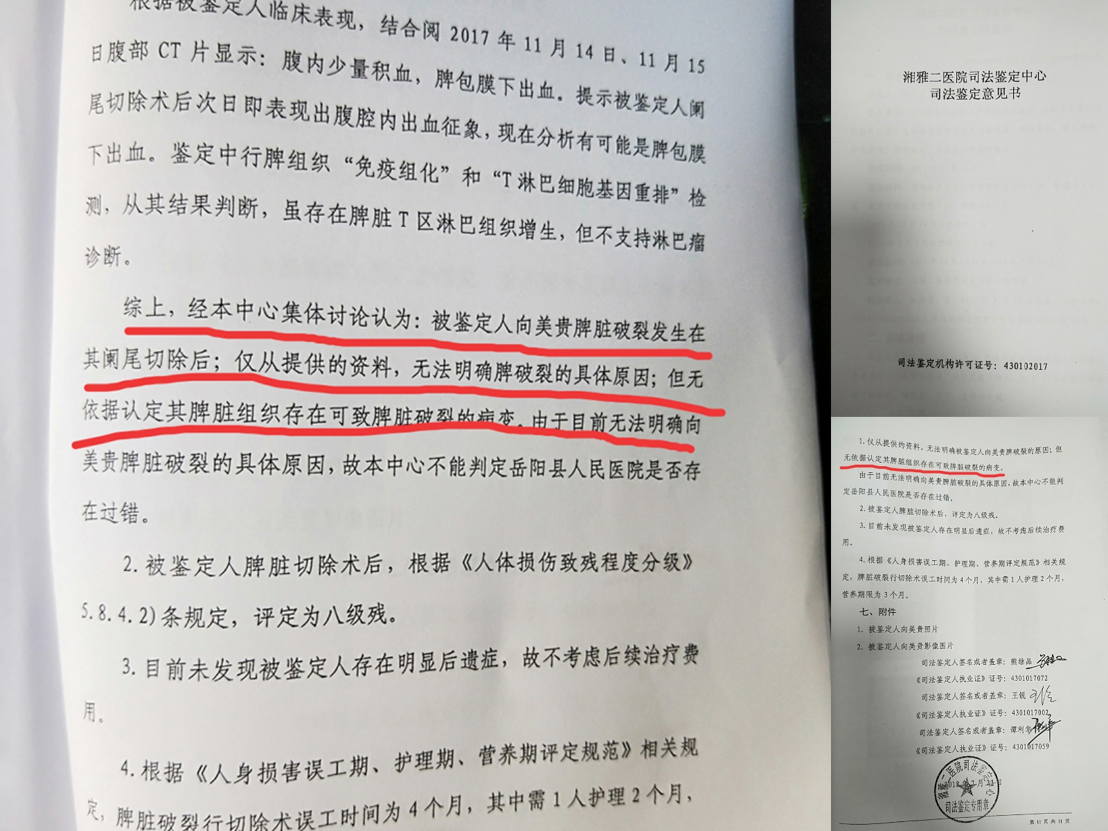 我的父親向米貴2017年11月10日晚因腹痛入嶽陽縣人民醫院急診,11日轉住院部,經人民醫院做B超、CT診斷為急性闌尾炎,其它器官並無任何問題。且在當日進行闌尾切除手術,自術後盆腔導流管開始不明原因的流血不止。11月15日對我父親進行腹腔鏡探查,探查見脾髒破裂,後再次進行切腹手術將脾髒切除。17日將脾髒送長沙金域檢驗未發現脾髒有任何病變。醫院態度也著實讓人心涼!关键词2向法院起訴後,法院委托長沙湘雅二醫院司法鑒定中心進行鑒定,脾髒樣本及所有資料、圖片全部移交鑒定中心,給出的結果是破裂發生在闌尾手術後,排除病理性破裂。