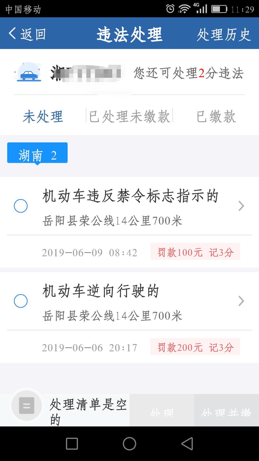 再次反饋: 沒看清附件嗎?兩份罰單都是六月份,相差3天,據我朋友所說,他們的罰單也是和我同一天從那裏經過,按違反禁令標誌行駛處罰的,罰100扣3分(需要我截圖給你們看嗎),別扯到5月份兩天上麵去。告知方式也存在問題,現在很多人都住嶽陽,為什麽不在嶽陽市交警支隊微信公眾號上麵告知,現在有幾個人看電視,更何況嶽陽城區也收不到嶽陽縣電視台,造成一天不知道有多少車輛在那裏違章(一塊單行線標誌牌也被擋住了,看不清)。