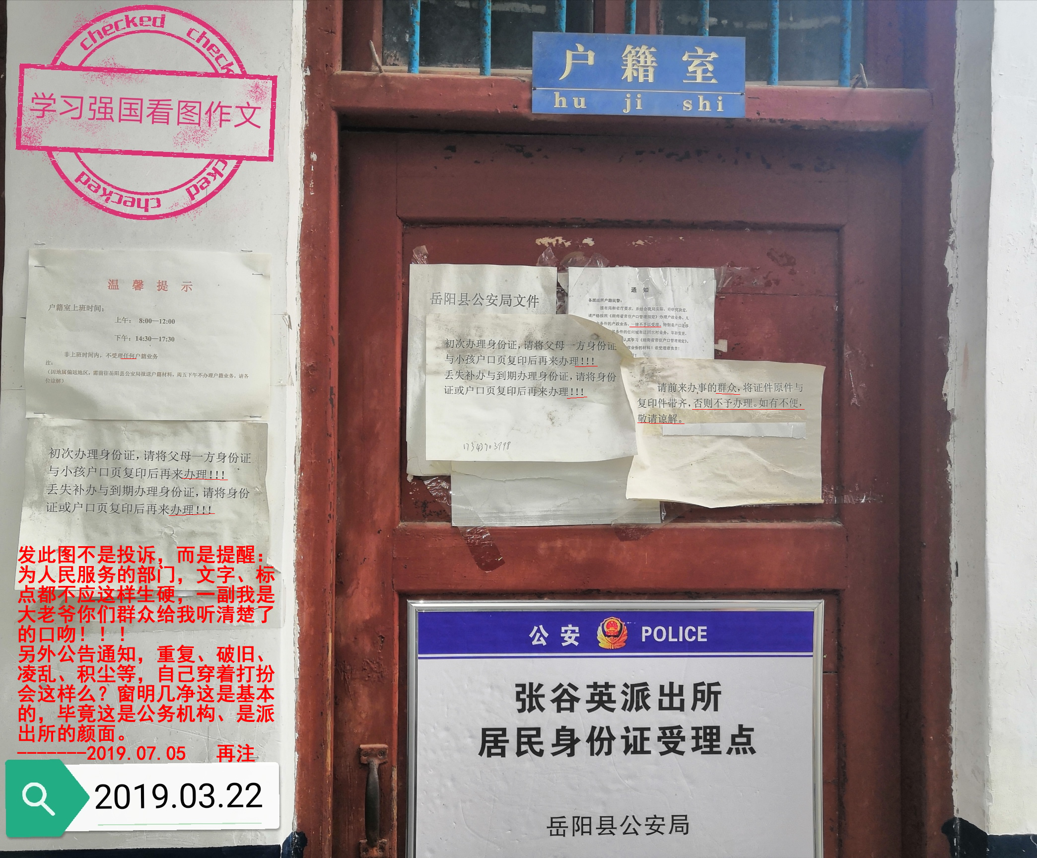3月22日提交的圖片,不是投訴業務沒及時辦理,我當時經村委員解釋,已經接受當天下午辦不成事的原因,無異議。發這圖是建議張穀英派出所,把通知上的語氣改改,為人民服務,這是黨的宗旨,服務就真的要溫馨,而不是抬頭一個溫馨提示,內容全市三個連續的感歎號,或者用,否則,一律,不予,言不由衷的敬請諒解等,簡而言之,態度好點,而不是字裏行間流露出高人一等大老爺的口氣,也不要垮著一張臉好像是給來辦事人莫大恩賜一樣,縣一級和市一級的政務服務中心或公安局窗口,都是微笑服務,能感受到真誠,派出所是基層一線,更接近老百姓,請不要用生硬冰冷的文字或語氣。另外衛生不要說沒有保潔阿姨,窗明幾淨是最基本的,更不用說蜘蛛網了,一屋不掃談什麽為人民服務,別說忙沒時間,收拾自己穿著化妝打扮有時間麽?我是張穀英鎮的人,我並不是要找茬,隻是想幫助改進提升,張穀英是旅遊景點,本地和外地人和派出所打交道的都不少,別一副蕭條敗落的情景,即使要搬遷新辦公地,在搬遷之前,也請繼續做好搬遷之前的事,這是工作場所,更是黨和政府機構聯係一線群眾的窗口,不說要豪華,至少要溫馨和幹淨。----2019.07.05,再次反饋,以示建議。