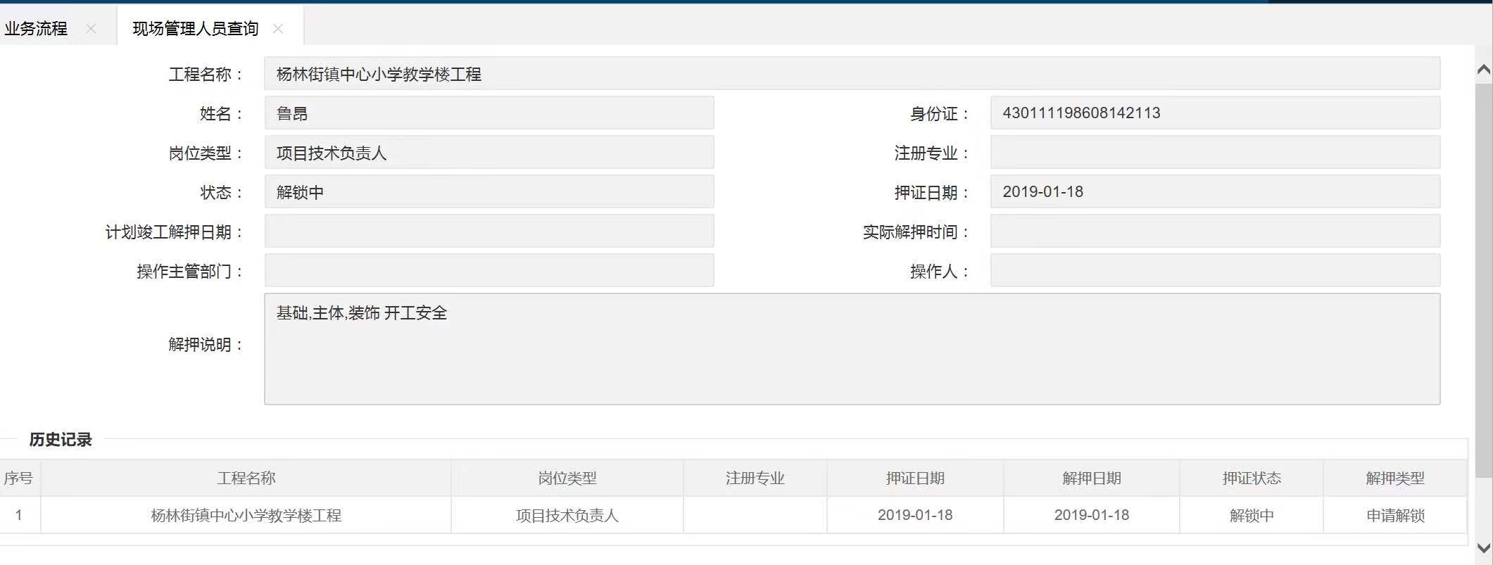 本人2018年底在嶽陽縣楊林鎮小學擔任技術負責人,中級職稱是鎖定的。現項目已竣工5個多月了,已經走了證書撤出程序,湖南建築市場監管公共服務平台網站卻一直還在顯示解鎖中。不知是何原因。 根據施工企業經辦人反映,2019年5月份已進行撤證申請,並多次上門谘詢進展情況,但嶽陽縣安監部門回複說係統故障,不能完成解鎖。 且經谘詢嶽陽市招投標辦,2019年5月確實存在監管部門係統問題,但係統早已更新,且已集中進行過嶽陽地區的操作培訓。                        請早日解決此問題為感。