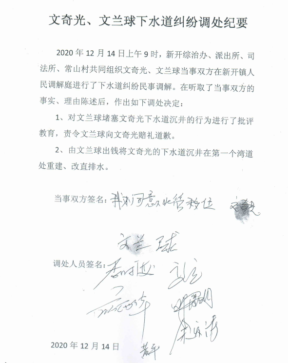 我鎮相關工作人員調查了事實經過並認真聽取了當事人雙方意見,由文蘭球向文奇光道歉並重建下水道,由新開鎮政府綜治辦、派出所、司法所及常山村聯合出具的調處紀要如下。我鎮工作人員已向當事人建議,不服政府相關部門調處的有權向人民法院提出公訴,我鎮相關部門將配合法院調查取證。