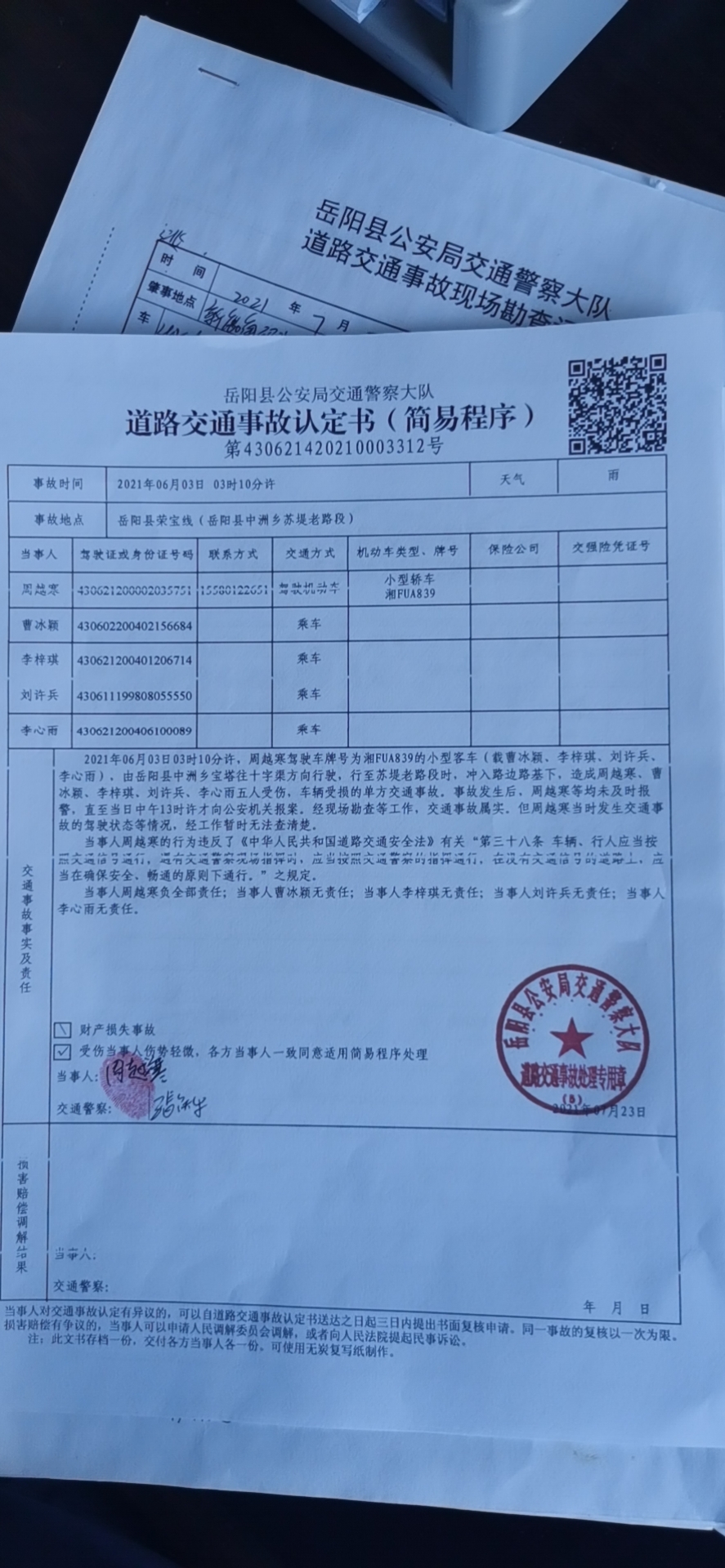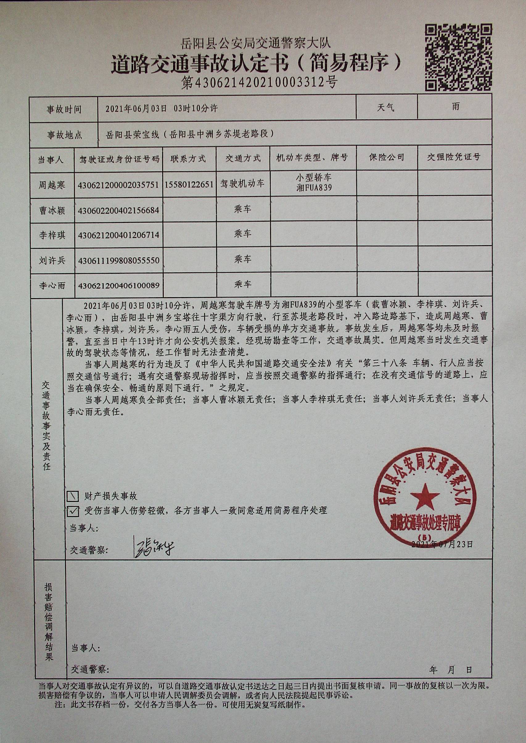 | 回複內容: | 向紅網友: 您好!您的來信已收悉,現回複如下: 一、接處警情況 2021年6月3日下午13時30分,嶽陽縣公安局交警大隊值班室接到車主吳某電話(18073028212)的報警,稱在嶽陽縣中洲鄉蘇堤老路段發生交通事故。值班民警張鐵牛、輔警高建輝立即趕赴現場,於下午13時54分許到達現場進行現場勘查及調查。 現場位於中洲鄉鄉鎮公路蘇堤老路段路口往西約50米處的左側路基下玉米地裏,車輛牌照為湘FUA839,橫臥於玉米地裏,車輛損壞比較嚴重,現場有報案車主吳帆宇及車輛當時出事故的駕駛人周越寒(肇事司機),另外有看熱鬧的周邊群眾。通過詢問報案人吳帆宇及肇事司機周越寒後得知事故是當日淩晨3點多鍾發生,當時周越寒駕駛該車,車上有四個朋友謝穎、李梓琪、李欣雨、劉兵均已受傷送至嶽陽縣人民醫院治療,工作人員現場對司機周越寒進行了呼氣式酒精測試,顯示為未飲酒。勘查完現場後對肇事車輛進行了拖離暫扣。處理完現場後,民警對周圍的群眾進行了走訪、調查。因當時事故發生在淩晨及離居民區較遠,沒有發現當時發生事故的知情群眾。 二、事故處理情況 此交通事故立案後,辦案民警依法對肇事司機周越寒及車上乘客進行了傳喚詢問,均未發現其它違法行為證據,並將調查情況及時與此車輛的投保公司太平洋保險公司嶽陽縣分公司業務員進行了通報溝通。在傷者家屬及車主吳帆宇的正當要求下,2021年7月23日,交警大隊秩序中隊對此事故進行了實事求是的單方事故責任認定。 經調查,無證據證明辦案民警有違法違規行為。 附:1、道路交通事故認定書 2、呼氣式酒精測試現場截圖 感謝您對关键词2工作的監督,祝您生活愉快! 嶽陽縣公安局交通警察大隊 2021年9月10日