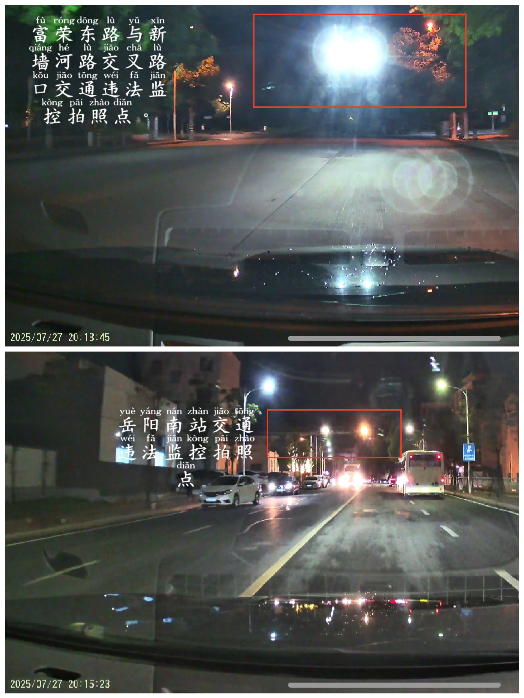 尊敬的交通警察支隊領導: 富榮東路與新牆河路交叉路口,交通違法拍照監控燈過於太亮,照射眼睛,容易導致駕駛員眼睛出現眩光,易發生交通事故。請把這個交通警察違法拍照點,進行優化或者把燈光調暗一點,在附件中上傳了,另一處,嶽陽南站交通違法監控燈的亮度是眼睛正常範圍可以接受的。 |