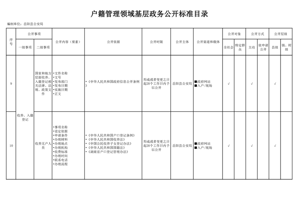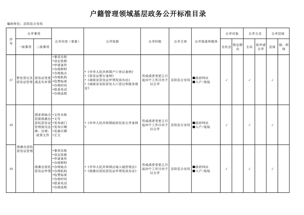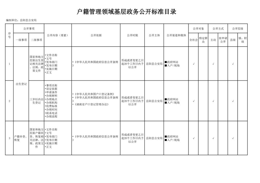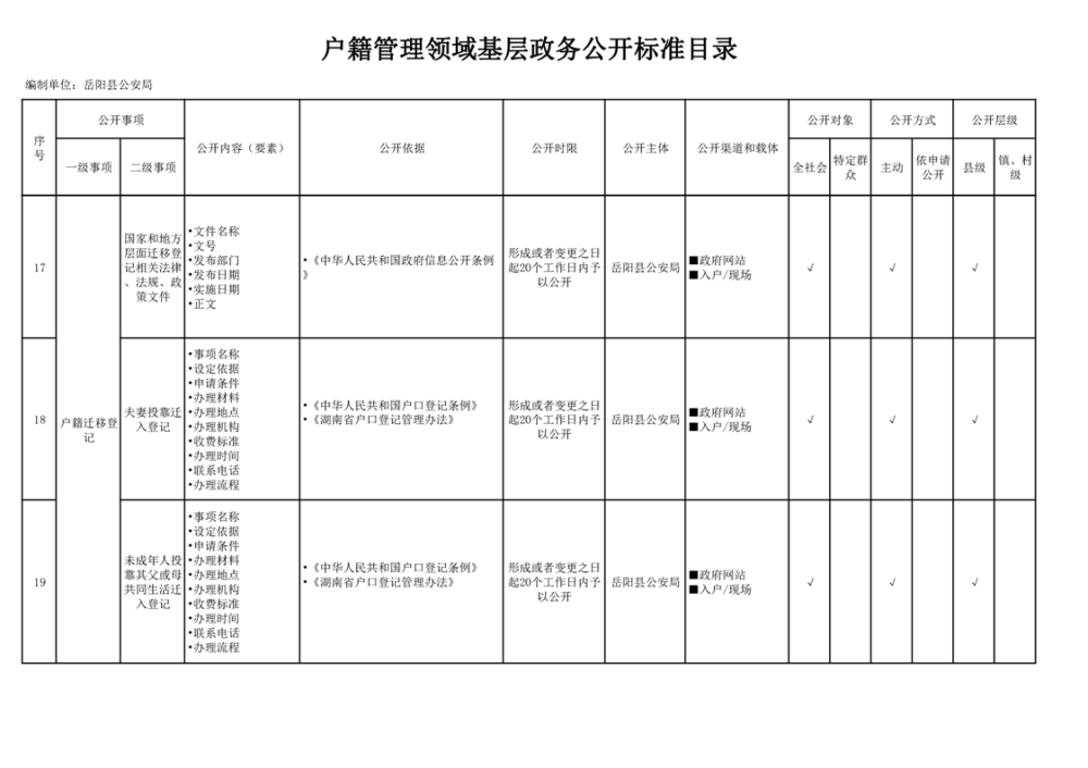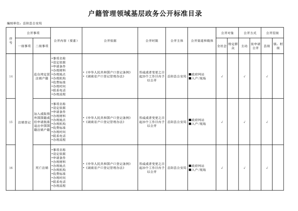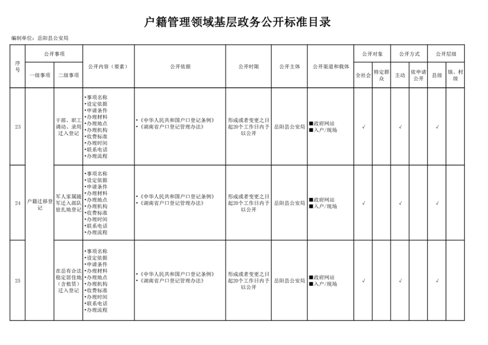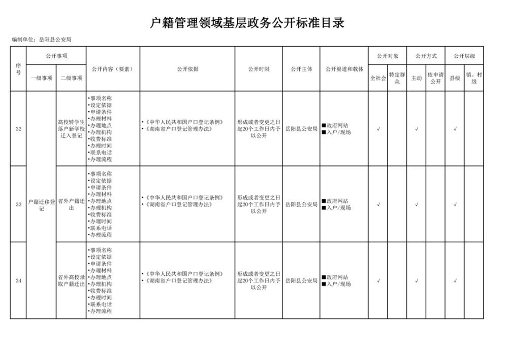嶽陽縣戶籍管理領域基層政務公開標準目錄
