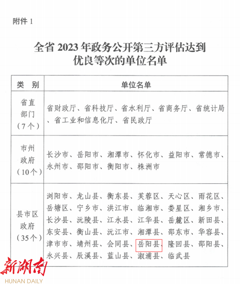 湖南日報·新湖南客戶端2月19日訊(通訊員 續鼎)近日,湖南省人民政府辦公廳印發《湖南省人民政府辦公廳關於全省2023年政務公開第三方評估情況的通報》(湘政辦函〔2024〕5號),通報公布了評估達到優良等次的單位名單,全省7個省直部門、10個市州政府、35個縣市區政府政務公開工作獲表彰。其中,嶽陽縣評估成績達到優良等次。這是嶽陽縣在獲評“五年一度”湖南省“政務公開工作先進單位”後,再次獲得全省先進,是省政府對嶽陽縣政務公開工作的再次肯定和表彰。